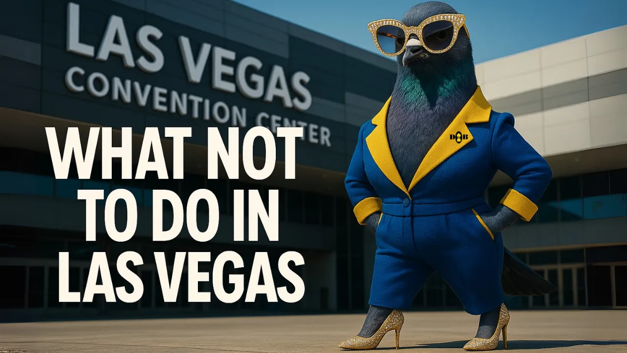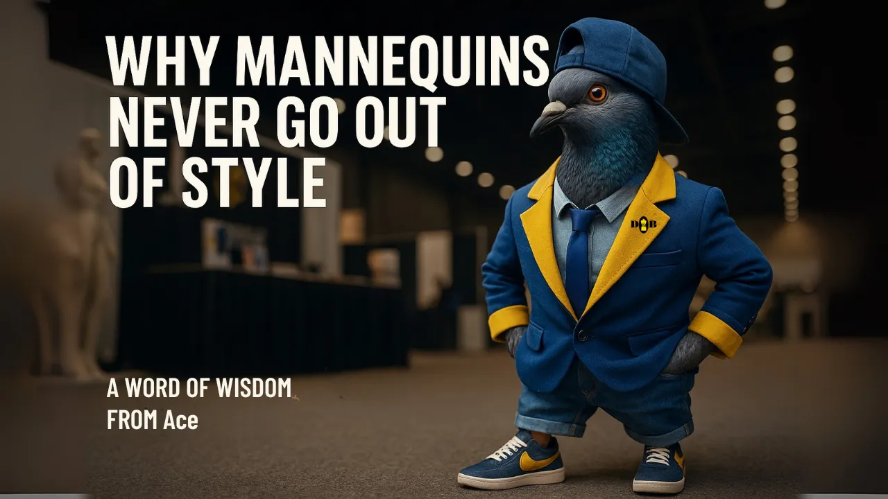“I’ve watched exhibitors panic over power cords—mannequins never need one.” —me, Ace the Pigeon, watching it all from the ceiling truss.